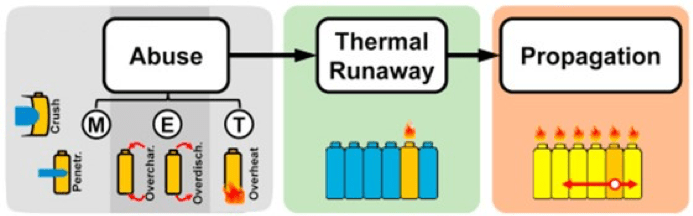 The cause of these fires is thermal runaway, a term that describes the rapid increase in temperature caused when the energy generated within a cell is larger than that which can be dissipated by the cell. To further complicate the situation, the sudden dissipation of energy in one cell may result in heating of neighboring cells leading to thermal runaway at the battery level, as shown in Figure 1. This propagation of the runaway event can proliferate to all of the cells in the battery, leading to a much more energetic and potentially catastrophic event. To prevent propagation of a cell failure, it is important to understand the thermal pathway from cell-to-cell, which requires an understanding of the transport properties of the cells.