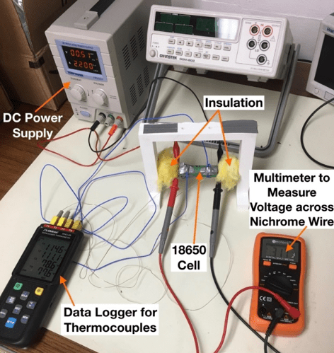 The experimental setup is shown in Figure 3. In each experiment, current was supplied to the wire until the temperature measurements stabilized, indicating the cell had reached a steady state. The power supply was then disconnected and the cell was left to cool in preparation for the next trial. In each case, tests were run at several different power levels to evaluate the consistency of the results.