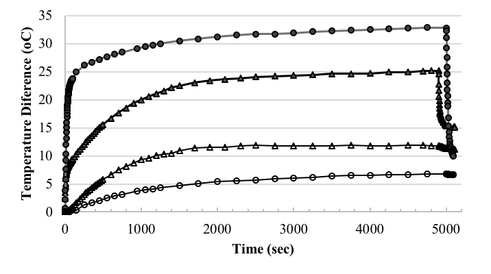 Multiple experiments were done on each cell for different power inputs. The power input to the wire ranged from 0.35 W to 1.5 W resulting in temperature differences between the inside and the outside of the cell of 4oC to 38oC. To minimize damage to the windings, the maximum temperature of the cell was kept to temperatures below 65oC. The uncertainty in the measurements was computed using a root-sum-square (RSS) method on all the variables used to calculate in Equation 1.