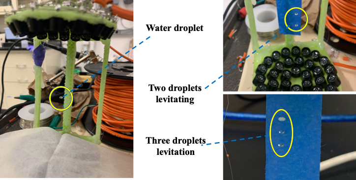 After implementing this device, we experimentally demonstrated the effectiveness of the levitation by levitating liquid droplets and air bubbles stably. In contrast to levitating solid particles in this device, it is trickier to achieve a stable trap for liquid matter. Here a special needle (a straight needle bent to a right angle) was utilized to squeeze a small amount of water around the standing wave in this levitator. Figure 8 demonstrates the performance of levitating one, two and three water droplets in this device, since the distance between the two acoustic-wave-emitting planes allows for several nodes that are suitable for the balance of gravity and acoustic pressure. It is important to note that these levitated states can last for more than several minutes. However, atmosphere disturbance, water evaporation, and unstable power supply can cause failure in stable levitation.