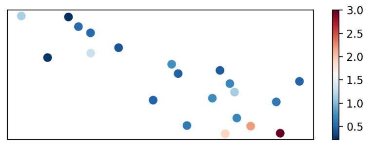 There is a significant variation in the measured intensity of FRBs. As previously discussed, while an FRB’s higher measured intensity may be an intrinsic property of the burst, it may also result from that FRB having originated closer to Earth. So, to ensure that our program is not biased by FRB intensity – that is, to show that we are not clustering FRBs by their proximity to Earth – we have also produced Fig. 7-8, in which FRBs are colored by peak intensity.