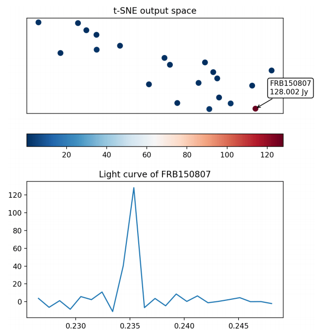look like ones, etc. This structure-preserving property is essential for our goal of clustering FRB light curves by topological similarity, which is why we chose t-SNE for this project. Additionally, the previously-discussed success in unambiguously clustering GRBs (Fig. 4) was also accomplished using t-SNE, further motivating our choice of dimensionality-reduction algorithm.