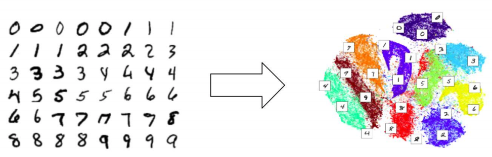 The example of classifying hand-drawn digits also illustrates how t-SNE preserves the macroscopic structure of the objects being clustered: fours look like nines, so those two clusters end up together; nines look like sevens, who