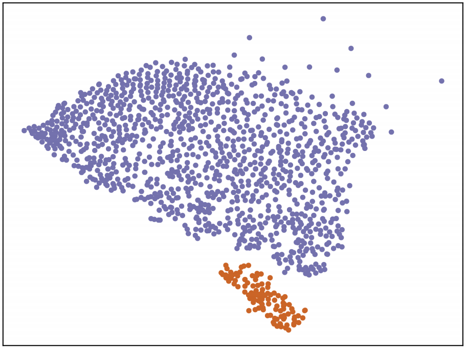 To solve this problem, instead of only using two measurements, all of the data were use. The challenge with this is what is known as “the curse of dimensionality”9. Suppose we want to plot objects in N dimensions, where N is the number of measurements. As N increases, so does the sparsity of the data points, meaning that all objects appear to be dissimilar in many ways. The solution was to use what is known as a dimensionality-reduction algorithm. As the name suggests, dimensionality-reduction algorithms take in a set of high-dimensional vectors that model some dataset, then cluster those vectors in a lower-dimensional space – usually in two dimensions – grouping them in a way that preserves the structure of the high-dimensional data. This means that, in the low-dimensional output space, similar objects stay close in and dissimilar objects stay distant. This idea is illustrated in Fig. 3.