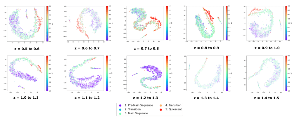 Figure 5 shows ten two-dimensional t-SNE maps, with each containing the galaxies in COSMOS in the labeled redshift range of size 0.1. In each of these maps, it is apparent that there is a gradual transition from galaxies in Region 1, which are the Pre-Main Sequence galaxies, to galaxies in Region 3, which are the Main Sequence Galaxies, and then to galaxies in Region 5, which are the quiescent galaxies. Galaxies in Regions 2 and 4, which were the transitions, also seem to be properly located on the maps so that the galaxies are arranged roughly sequentially from Region 1 up to Region 5.