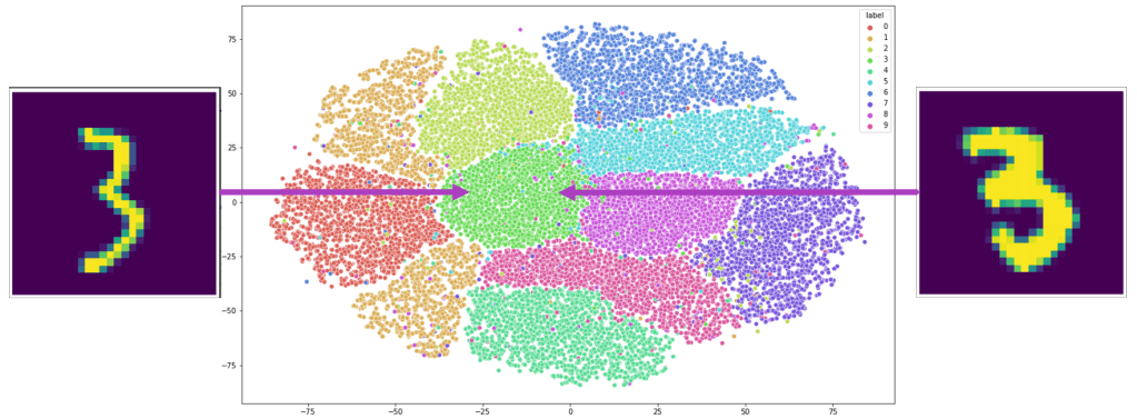As seen in Figure 4, t-SNE has accurately clustered together images of the same digit in a two-dimensional space. The way in which t-SNE arranges the distinct clusters of digits is also significant. Consider the green cluster of images of the digit ‘3’ in the middle of the map. An image of a ‘3’ on the left side of the cluster, nearer to the orange cluster of images of the digit ‘1’, is more vertical—resembling a ‘1’. On the other hand, an image of a ‘3’ on the right side of the cluster, nearer to the purple cluster of images of the digit ‘8’, is more round and more closely resembles an ‘8’. Even across clusters, t-SNE places data points near other similar points, which is useful in other real-world datasets such as COSMOS that lack well-defined clusters.