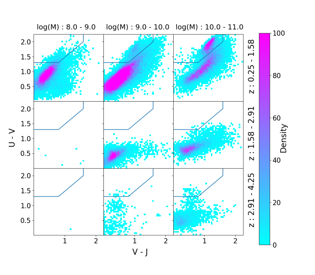 First, multiple previous studies have shown that star-forming galaxies and quiescent galaxies can be clearly distinguished on a U-V vs. V-J (UVJ) diagram [14]. The U-V color band contains wavelengths from ultraviolet to visible light while the V-J color band contains wavelengths from visible to near-infrared light. Plotting galaxies of similar redshift and mass on a UVJ diagram that compares each galaxy’s fluxes in the U-V color band and the V-J color band, we see that star-forming galaxies and quiescent galaxies are clustered separately on either side of a distinct boundary (Figure 1).