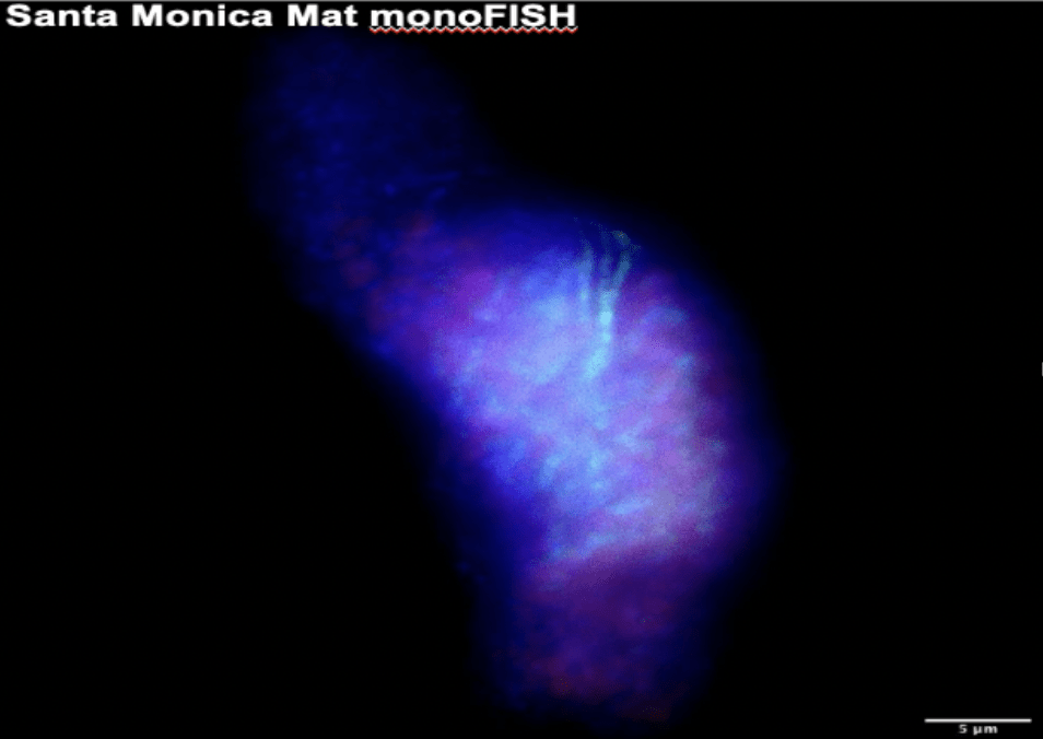 On Day 2, the slide was washed with a 40% wash buffer for 10 minutes at 48 ˚C. Then, the slide was dipped for 30 seconds in nanopure water. 20 μL of DAPI-Citiluor solution was added to the dried slide before covering it with a glass cover slip. A Zeiss Elyra PS.1 microscope with a 1.4 NA 100x oil immersion objective captured images and Z-stacks. FIJI colorized images and merged visual data 7.
