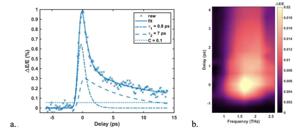 We used the reflectivity data to study the evolution of the material after the pump pulse to understand how the material responds to this photo-doping. After the pump pulse interacts with the material, the material relaxes, releasing the energy from the pulse over time and returning to its initial state. The time scale of this relaxation signifies what sort of response, and hence phenomenon, has occurred due to the laser pulse. We see in Fig 6a that the change in electric field decays very rapidly for a short amount of time and then much more slowly for the rest of the measurement. Therefore, we break down the total exponential decay into two exponentials, one with a fast decay time and the other with a slower decay time, 0.8 ps and 7 ps respectively. These two decay times are also portrayed in Fig 6b through the initial high rate of change in intensity of ∆E/E, followed by a slower decay.