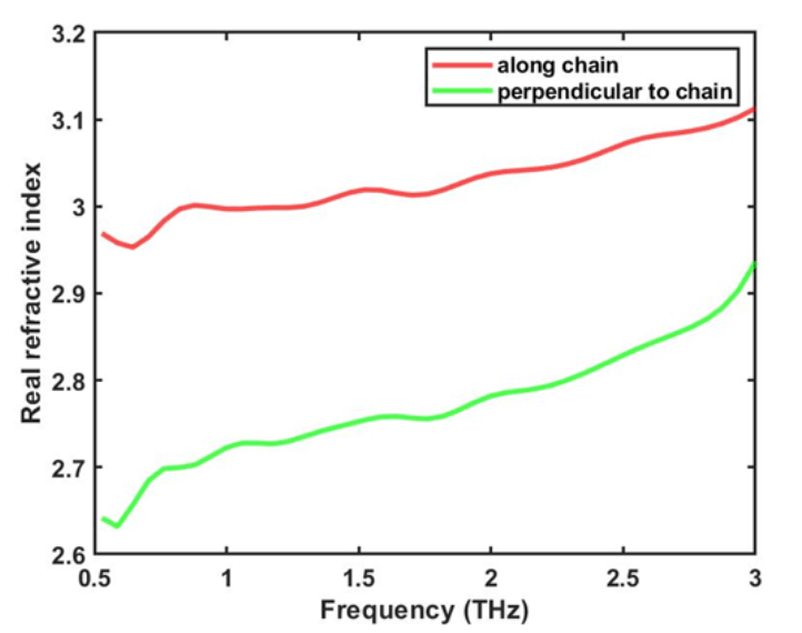 We attribute part of the four-fold symmetry to birefringence. Birefringence is when the light’s path through the sample is delayed more in one direction than in the perpendicular direction. Therefore, the refractive indices of the material, which are a measure of this delay, are different. Our calculations of the refractive index along the chain and perpendicular to the chain support this claim (Fig 8). We see that the refractive index along the Cu-O chain is in the 3-3.1 range whereas the refractive index perpendicular to the Cu-O chain is in the 2.65-2.9 range. Hence, light is more delayed in the Cu-O chain direction than in the perpendicular direction.