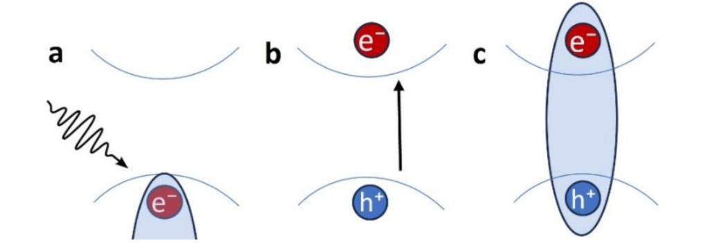 The two decay times we observed signal that there may be two phenomena occurring in the material when energy is added to the system with the pump pulse. In some cases, the faster decay indicates an electronic response whereas the slower decay may be from the material cooling down after being heated from the pump pulse [4]. One theory for the first phenomenon is that we are seeing Coulombic excitons (Fig 9), that are quickly forming and then relaxing back to their unbound state (Fig 9a) after the pump pulse [6].